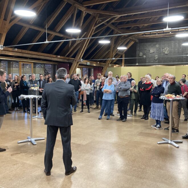 Die acht neuen Einwohnerrätinnen und Einwohnerräte wurden am Wahlsonntag bei einem Apéro im Bauernhaus an der Limmat gefeiert. Daran nahm auch der Badener Stadtrat in corpore teil. Stadtammann Markus Schneider und Gemeindeammann Adrian Schoop überreichten den frisch Gewählten ein Präsent mit Turgemer Spezialitäten und freuten sich über die breit aufgestellte politische Verstärkung aus dem neuen Ortsteil.